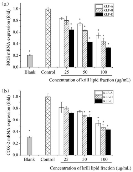 Effect of three krill lipid fractions on mRNA expression of inducible enzymes (a) iNOS and (b) COX-2 in RAW264.7 cells with LPS stimulation. Blank group referred to the untreated cells; cells treated with LPS alone were considered as the control group. * p < 0.05 versus the control group; one-way analysis of variance (ANOVA) combined with the Games–Howell test was used to analyze the significance. Abbreviations: LPS, lipopolysaccharide; KLF-A, the krill lipid fraction extracted with acetone in the first step; KLF-H, the krill lipid fraction extracted with hexane in the second step; KLF-E, the krill lipid fraction extracted with ethanol in the third step.