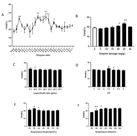 Effect of different enzymatic hydrolysis factors on the melanin yield of Inonotus hispidus. (A) Enzyme ratio; (B) Enzyme addition; (C) Liquid-to-material ratio; (D) Enzymatic pH; (E) Enzymatic hydrolysis temperature; (F) Enzymatic hydrolysis time. (A,B) compared with the blank group; (C–F) compared with the front group. Superscript characters indicate significant variation, * p < 0.05, ** p < 0.01.