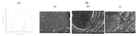 (A) Infrared absorption spectrum of soluble IHFM; (B) Scanning electron micrograph of soluble IHFM, (a) 10 µm; (b) 400 nm; (c) 100 nm.