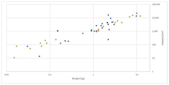 Overview of weight and volume (height × width × length) distribution of some selected commercially available devices used for food authentication according to type of technology (only devices where both weight and size/volume are available are included).