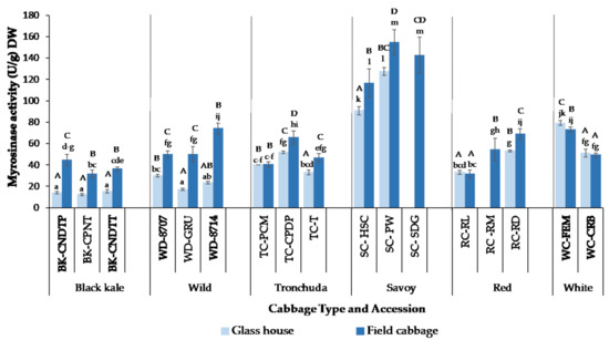 Myrosinase activity of field and glasshouse grown cabbages. Values are means of three biological replicates (each replicate comprising 4–5 cabbage heads) and two separately extracted technical replicates (n = 6). Error bars represent standard deviation from mean values. Missing data points implies cabbage accession did not survive under glasshouse growing conditions. Letters “A-D”: bars not sharing a common uppercase letter indicates significant differences (p < 0.0001) between accessions and growing conditions within a cabbage morphotype. Letters ”a-k”: bars not sharing a common lowercase letter indicates significant differences (p < 0.0001) between accessions and growing conditions between cabbage morphotypes. See Table 1 for full names of cabbage accessions.