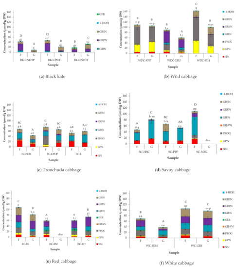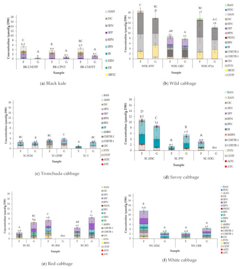 Glucosinolate hydrolysis products (GHPs) (µmol/g DW) in different accessions of (a) Black kale; (b) Wild cabbage; (c) Tronchuda cabbage; (d) Savoy cabbage; (e) Red cabbage; and (f) White cabbage grown in the field and glasshouse. Error bars represent standard deviation from mean values. Letters above bars refer to differences in total GHP concentration. Letters “A-D”: bars not sharing a common uppercase letter differ significantly (p < 0.05) between accessions and growing conditions within a cabbage morphotype (i.e., within each separate graph). Letters ”a-l”: bars not sharing a common lowercase letter differ significantly (p < 0.0001) between cabbage morphotypes, accessions, and growing conditions (i.e., between the separate graphs). Compounds with colour shades similar to one another are GHPs of corresponding GSLs presented in Figure 2. Abbreviations: F = Field; G = glasshouse; dns = did not survive. For abbreviations of accessions and compounds see Table 1 (cabbage accessions) and Table 3 (GHPs).