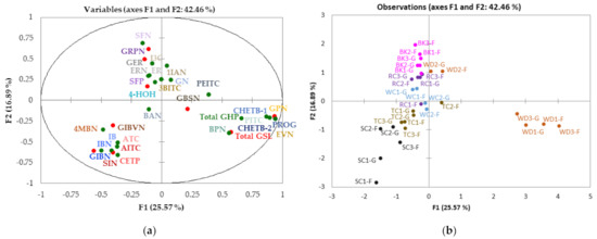 MFA map of glucosinolates and glucosinolate hydrolysis products (a) distribution of variables and (b) sample distribution. For codes and distribution on plot, refer to Table 1 (cabbage accessions) and Table 2 and Table 3 (compounds). Compounds with different shades of the same colour in Figure 3a refer to the GSL and corresponding GHP. Key: F = Field ; G = Glasshouse; ● GSL = Glucosinolates; ● GHPs = Glucosinolate hydrolysis products; ● BK= Black kale; ● WD = Wild cabbage; ● TC= Tronchuda cabbage; ● SC = Savoy cabbage; ● RC = Red cabbage; ● WC = White cabbage.