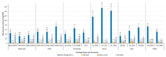 In our earlier paper investigating the effect of accession identity and growing conditions on myrosinase activity, GSL and GHP in 18 cabbage accessions, we discussed in detail the results of myrosinase activity, as well as the profile and concentration of GSL and GHP, between the raw accessions []. In this paper, the focus is on the effects of cooking on these accessions. This study, therefore, examines the effect of steaming, microwaving, and stir-frying on myrosinase stability, GSL and GHP profiles and concentrations in 18 cabbage accessions. Cooking times were chosen to represent standard domestic practices. It was hypothesised that, through controlled domestic cooking processes, myrosinase and GSL stability would be maximised, thereby increasing the production of ITCs, and improving the health benefits associated with cabbage consumption. It was also hypothesised that the genetic background of the cabbage and its morphotype would impact the observed stability of myrosinase and GSLs, and the production of GHPs.