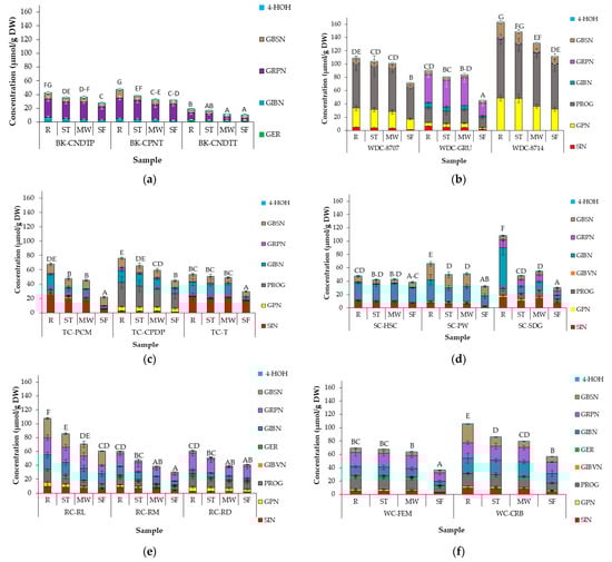 Glucosinolate concentrations (µmol/g DW) in different accessions of (a) Black kale; (b) Wild cabbage (c) Tronchuda cabbage; (d) Savoy cabbage; (e) Red cabbage and (f) White cabbage before and after domestic processing. Error bars represent standard deviation from mean values. Letters above bars refer to differences in total GSL concentration. Letters ‘A–G’: bars not sharing a common uppercase letter differ significantly (p < 0.05) between accession and cooking conditions within a cabbage morphotype (i.e., within each separate graph). For significant differences between cabbage morphotypes, accessions, and cooking methods (i.e., across the separate cabbage morphotype graphs) see Supplementary Table S4. Abbreviations: R = raw, ST = steamed; MW = microwaved; SF = stir-fried; BK-CPNT: cavolo palmizio; BK-CNDTT: cavolo nero di toscana o senza testa; WD-8707: wild cabbage 8707; WD-GRU: wild cabbage 7338; WD-8714: wild cabbage 8714; TC-PCM: penca mistura; TC-CPDP: penca povoa; TC-T: tronchuda; SC-HSC: hybrid savoy wirosa; SC-PW: pointed winter; SC-SDG: dark green; RC-RL: red langendijker; RC-RM: rocco marner (Hybrid); RC-RD: red Danish; WC-FEM: early market; WC-CRB: couve repolho. For abbreviations of compounds, see Table 1 (GSLs).