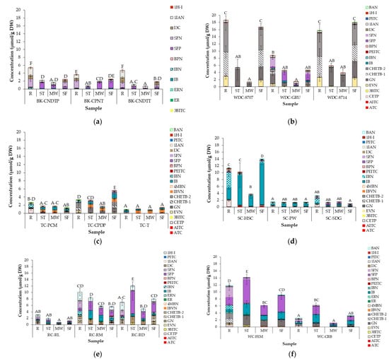 Glucosinolate hydrolysis products (GHPs) (µmol/g DW) in different accessions of (a) black kale; (b) wild cabbage (c) tronchuda cabbage; (d) Savoy cabbage; (e) Red cabbage and (f) white cabbage before and after domestic cooking. Results are expressed as sulforaphane equivalents. Error bars represent standard deviation from mean values. Letters above bars refer to differences in total GHP concentration. Letters ‘A–F’: bars not sharing a common uppercase letter differ significantly (p < 0.05) between accessions and cooking methods within a cabbage morphotype (i.e., within each separate graph). For significant differences between cabbage morphotypes, accessions, and cooking methods (i.e., across the separate cabbage morphotype graphs), see Supplementary Table S5. Compounds with similar colour shades are GHPs (with nitriles in pattern fill) of corresponding GSL, presented in Figure 2. Abbreviations: R = raw, ST = steamed; MW = microwaved and SF = stir-fried; BK-CPNT: cavolo palmizio; BK-CNDTT: cavolo nero di toscana o senza testa; WD-8707: wild cabbage 8707; WD-GRU: wild cabbage 7338; WD-8714: wild cabbage 8714; TC-PCM: penca mistura; TC-CPDP: penca povoa; TC-T: tronchuda; SC-HSC: hybrid savoy wirosa; SC-PW: pointed winter; SC-SDG: dark green; RC-RL: red langendijker; RC-RM: rocco marner (Hybrid); RC-RD: red Danish; WC-FEM: early market; WC-CRB: couve repolho. For abbreviations of compounds, see Table 2 (GHPs).