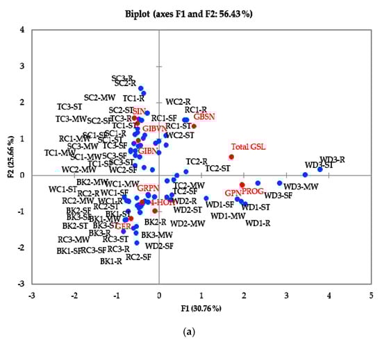 MFA map of glucosinolates and glucosinolate hydrolysis products (a) distribution of variables and (b) sample distribution. Abbreviations: R = raw, ST = steamed; MW = microwaved; SF = stir-fried; BK1: cavolo nero di toscana o senza palla (BK-CNDTP); BK2: cavolo palmizio (BK-CPNT); BK3: cavolo nero di toscana o senza testa (BK-CNDTT); WD1: wild cabbage 8707 (WD-8707); WD2: wild cabbage 7338 (WD-GRU); WD3: wild cabbage 8714 (WD-8714); TC1: penca mistura (TC-PCM); TC2: penca povoa (TC-CPDP); TC3 tronchuda (TC-T); SC1: hybrid savoy wirosa (SC-HSC); SC2: pointed winter (SC-PW); SC3: dark green (SC-SDG); RC1: red langendijker (RC-RL); RC2: rocco marner (Hybrid) (RC-RM); RC3: red Danish (RC-RD); WC1: early market (WC-FEM); WC2: couve repolho (WC-CRB). Colour codes: Pink = Black kale; Brown = Wild cabbage; Dijon yellow = Tronchuda cabbage; Black = Savoy cabbage; Purple = Red cabbage; Blue = White cabbage. Compounds with different shades of the same colour in Figure 5a refer to the GSL and corresponding GHPs. For compound codes on plot, refer to Table 1 and Table 2.