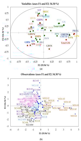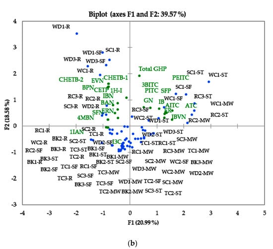(a) PCA plot for tested samples and their relative distributions in relation to GSL concentrations. (b) PCA plot for tested samples and their relative distributions in relation to GHP concentrations. Abbreviations: R = raw, ST = steamed; MW = microwaved; SF = stir-fried; BK1: cavolo nero di toscana o senza palla (BK-CNDTP); BK2: cavolo palmizio (BK-CPNT); BK3: cavolo nero di toscana o senza testa (BK-CNDTT); WD1: wild cabbage 8707 (WD-8707); WD2: wild cabbage 7338 (WD-GRU); WD3: wild cabbage 8714 (WD-8714); TC1: penca mistura (TC-PCM); TC2: penca povoa (TC-CPDP); TC3 tronchuda (TC-T); SC1: hybrid savoy wirosa (SC-HSC); SC2: pointed winter (SC-PW); SC3: dark green (SC-SDG); RC1: red langendijker (RC-RL); RC2: rocco marner (Hybrid) (RC-RM); RC3: red Danish (RC-RD); WC1: early market (WC-FEM); WC2: couve repolho (WC-CRB). Red coloured compounds = GSLs; Green coloured compounds = GHPs; Blue dots = Samples. For full names of compounds, see Table 1 and Table 2.