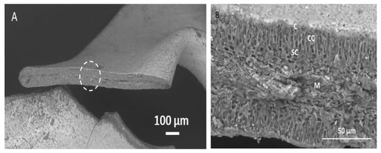 Figure 3D). Milling of the seaweed caused different types of breakage of the seaweed tissue. A few tissues are broken along the medullar region (