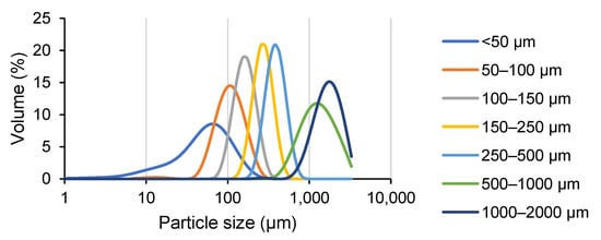 The particle size distribution of the different size fractions was analyzed using a Mastersizer 3000 (Malvern Panalytical Ltd., Malvern, UK). For each measurement, approximately 5 g of dry powder was loaded into the feeder. The refractive and absorption indexes were set to 1.5 and 0.1, respectively. Obscuration was chosen between 1–8%. Values were taken as the average from two measurements.