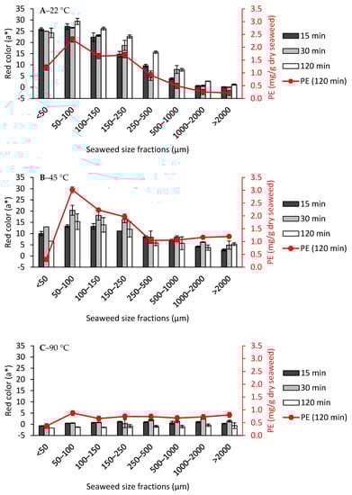 Figure 5A), the larger size seaweed fractions (>1000 μm) did not result in a red colored filtrate. However, the filtrates started to be visibly red from the size fraction 500–1000 μm and below, with its a* value increasing substantially with the decreasing size of the fraction, reaching the highest a* value at the second smallest size fraction, 50–100 μm for 2 h extraction (29.4 ± 1.4). The a* value at the smallest size fraction (<50 μm) was slightly less (24.3 ± 2.1). To be more accurate, the PE concentration was also quantified. Moreover, the PE concentration showed a steady increase with the decreasing size fraction, reaching the highest concentration at 50–100 μm with a PE concentration of 2.3 ± 0.1 mg/g dry seaweed (