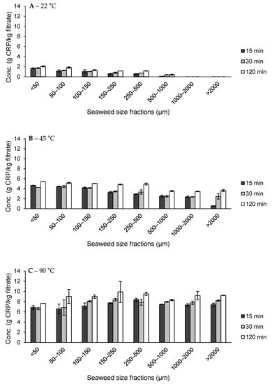 CRP extraction was performed on each size fraction for several time and temperature combinations. Extraction temperatures of 22, 45, and 90 °C were chosen to assess the effect of room, mild, and high extraction temperatures. Extraction times of 15, 30, and 120 min were selected to investigate the potential increase in carrageenan yield over time. A previous study [