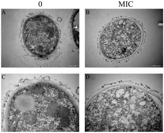 TEM characterization of A. flavus treated with paeonol at 0 (A,C) and MIC (B,D). Scale bar: 1 μm.