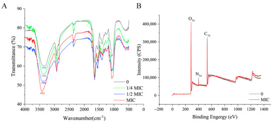Influence of paeonol on the cell walls of A. flavus. (A) FT-IR spectra of mycelia treated with paeonol at 0, 1/4 MIC, 1/2 MIC, and MIC. (B) XPS survey spectra of mycelia treated with paeonol at 0 and MIC.