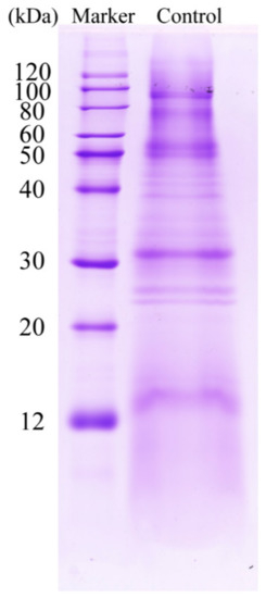 Although a previous study reported that a varied number of proteins in the surface of A. flavus mycelia were present based on different detection methods [21], the detailed information of these proteins are still lacking, therefore, we conducted a proteomic analysis to identify them. As the integrities of cell walls and cell membranes are injured by paeonol treatment, intracellular components would be inevitably released during the collection procedure, confounding the components of surface proteins in paeonol treated mycelia. Therefore, only the surface proteins of intact mycelia (control group) were analyzed. The concentration of extracted surface proteins was 0.5149 ± 0.02 mg/mL according to the Bradford method. Before identification, SDS-PAGE electrophoresis was conducted, and as shown in Figure 3, a large number of proteins falling in a wide molecular range can be visualized, and among them, intensive proteins are around 90, 55, and 30 kDa.