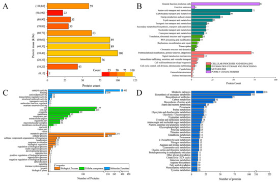By proteomic analysis, in total 605 proteins and 3639 peptides have been identified in intact mycelia. After alignment, all of the proteins have been identified. Although they are uncharacterized, their functions can be annotated by the GO, KOG, and KEGG pathways. First of all, the distribution of the proteins based on their mass is shown in Figure 4A. One hundred proteins are falling in the mass range of 30–40 kDa, and 89 proteins are in the mass range of 40–50 and 50–60 kDa, respectively. More than 50 proteins are falling in the range of 20–30, 60–70, and higher than 100 kDa. For KOG analysis, as shown in Figure 4B, there are 72 proteins classified in “amino acid transport and metabolism” and 71 proteins in “posttranslational modification, protein turnover, chaperones”. In Figure 4C, there are 590, 615, and 635 proteins classified in biological process, cellular component, and molecular function. To decipher the pathways the proteins participated in, we adopted KEGG analysis. According to the number of proteins in all categories, most of the proteins participated in the catalytic activity or metabolic process as these two biological functions rank the first in their respective category. As shown in Figure 4D, about 44% of proteins have been annotated in metabolic pathways, followed by biosynthesis of secondary metabolites and biosynthesis and antibiotics. These results indicated that A. flavus surface proteins are indeed involved in a myriad of biological functions.