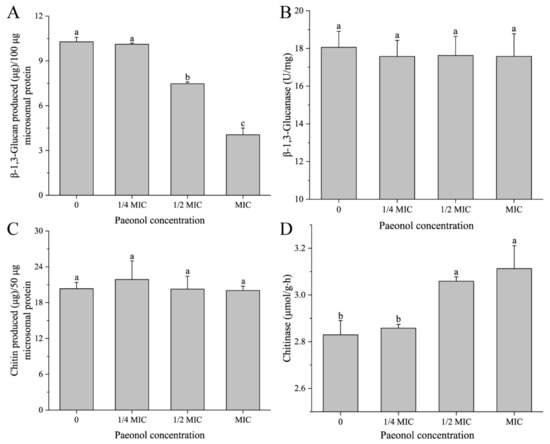 The decreased content of both β-1,3-glucan and chitin by peaonol treatment directed the hypothesis that the metabolism of them were regulated. In a variety of yeasts and filamentous fungi, the synthases catalyzing the biosynthesis of polysaccharides in cell walls are located across plasma membranes [32,33]. After the linear polysaccharide chains are formed, they have to be remodeled and cross-linked to construct a 3D structural network during the neosynthesized polysaccharides by the enzymes (e.g., hydrolases and glycosyltransferases) [33,34,35]. Excessive polysaccharides are degraded by enzymes, such as glucanase, chitinase, etc., [32,33,36].