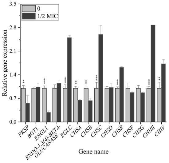 The above changes of activities of enzymes catalyzing β-1,3-glucan and chitin metabolism are indeed the comprehensive results of the expressions of several relevant genes participating in diverse functions, such as biosynthesis, reconstruction, and degradation. Therefore, quantifying changes of their relative expressions is of significance in revealing the antifungal effect of paeonol against A. flavus on the molecular level. Relative expressions of the genes are shown in Figure 6. A. flavus genome encodes only one β-1,3-glucan synthase, FKSP, and as expected, the relative expression of the FKSP gene decreased significantly with the treatment of paeonol at 1/2 MIC. We also quantified the expression level of the BGT1 gene, which is responsible for the elongation of the β-(1,3)-glucans [33], it was not changed by paeonol treatment, therefore, paeonol reduced the biosynthesis of β-1,3-glucan only by downregulating the expression of FKSP gene. In the degradation of A. flavus β-1,3-glucan, there exist three key genes: ENGL1, ENDO-1,3(4)-β-GLUCANASE, and EGLC. Among them, the relative expression of ENDO-1,3(4)-β-GLUCANASE gene was not changed remarkably, while ENGL1 gene and EGLC gene were downregulated by 0.71 fold and upregulated by 1.50 fold, respectively, probably leading to the unchanged activity of β-1,3-glucanase.