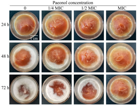 Peanut butter (Shandong Yinger Foodstuffs Co., Ltd., Zaozhuang, China) in a sealed can was bought from a local supermarket. Two grams of peanut butter were spread on a Petridish (d = 3.5 cm) and irradiated under UV light for 30 min. Then, fresh spores (2 × 105 spores/Petridish) were mixed with paeonol at final concentrations of 0, 1/4 MIC, 1/2 MIC, and MIC. The growth of A. flavus was visualized every 24 h.