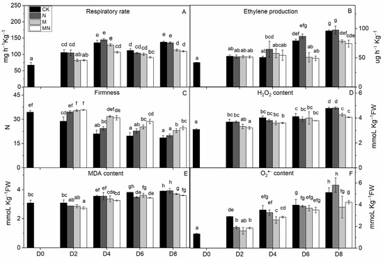 Physiological and biochemical indices of peach fruit including respiratory rate (A), ethylene production (B), firmness (C), H2O2 content (D), MDA content (E) and O2− content (F) used in this research. Each point represents means ± SE of three replicates. The lowercase letters indicate significant differences according to statistical analysis.