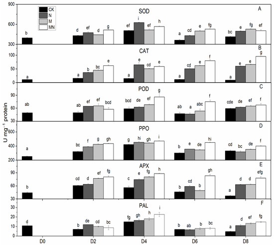 Enzymatic activity in peach fruit. SOD activity (A), CAT activity (B), POD activity (C), PPO activity (D), APX activity (E), PAL activity (F). Each point represents means ± SE of three replicates. The lowercase letters indicate significant differences according to statistical analysis.