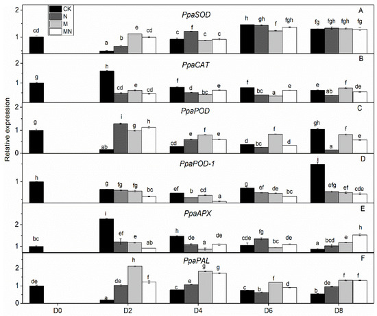 Sequence information on genes encoding POD and PAL was derived from Genome Database for Rosaceous (GDR; http://www.rosaceae.org/peach/genome (accessed on 16 October 2021)) and gene specific primers were designed using Primer 5.0 software and used for transcript sequencing. After screening of received sequencing data and discarding the redundant sequences, two PpaPODs and one PpaPAL were selected for further analysis. Primers for PpaSOD, PpaCAT and PpaAPX that were designed in previous research using the similar cultivar [20] were utilized herein. A translation elongation factor 2 (PpaTEF 2) was selected as s reference gene for its high expression stability [21]. All primers used for this study were showed in Supplementary Materials. Total RNA extraction, first-strand cDNA synthesis and real-time quantitative reverse transcription-polymerase chain reaction (qRT-PCR) analysis were performed according to our previous report [22].