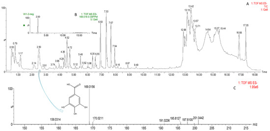 (A)Representative mass spectrogram of phenolic compounds from peach tissue extract from m/z 100 to 1000 (negative ionization mode); (B) mass spectrogram (MS) of galic acid at m/z 169.016; (C) MS/MS at 2.50 RM (negative ionization mode).