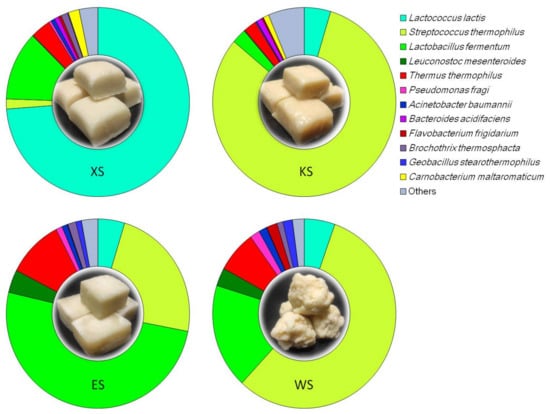 Dominant bacterial species with a relative abundance greater than 1% in different cheese samples. The sizes of the different-coloured areas in the rings represent the relative abundance of different dominant species. Cheese samples are shown in the middle of the rings. ES, cheese sample from the Ordos grassland; XS, cheese sample from the Xilingol grassland; KS, cheese sample from the Horqin grassland; WS, cheese sample from the Ulanqab grassland.