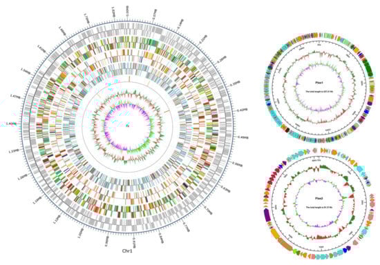 The sequencing of T. thermophilus N-1 generated 98,992 subreads and 655,471,669 base pairs, with 298-fold genome coverage. One contig without gaps was obtained after assembling the filtered low-quality reads with SMRT Link v5.0.1. A complete genome map of T. thermophilus N-1 was drawn (Figure 2). The complete genome was 2,194,207 bp in length and contained a circular chromosome with a G + C content of 69.51% and two circular plasmids with G + C contents of 69.33% and 67.95% (Table 2). Six rRNA operons, 48 tRNA genes, 11 genomics islands, 10 clustered regularly interspersed short palindromic repeats (CRISPRs), and 2328 protein-coding genes (CDSs) were identified. Twenty-one interspersed repetitive sequences, including 11 long terminal repeats (LTRs), 3 DNA transposons, 2 long interspersed repeated segments (LINEs), 4 short interspersed repeated segments (SINEs) and 1 unknown sequence, were identified. Additionally, 139 tandem repeat sequences (repeat size 9–228 bp), including 128 minisatellite DNA sequences (repeat size 11–56 bp), were found.