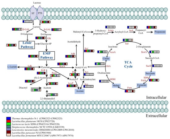 Subsequently, genomic data were collected from six different LABs isolated from different cheeses, including Lactobacillus plantarum 10CH, Lactococcus lactis SD96, Streptococcus thermophilus NCTC 12958, Leuconostoc mesenteroides DSM 20484, Lactobacillus paracasei NJ and Lactobacillus fermentum MTCC 25067, and the genes related to milk fermentation were annotated (Figure 4). We found that these reference LABs all harboured an enzyme not found in T. thermophilus N-1 that can metabolise D-galactose produced via lactose metabolism into glucose-6P through the Leloir Pathway, after which this product enters the EMP Pathway. These results showed that the LABs in Chinese Inner Mongolian cheese might have more available carbon source substrates than T. thermophilus N-1 for metabolism under conditions in which the same amount of lactose is metabolised.