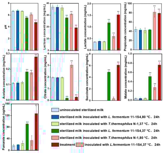 Validation of T. thermophilus N-1 fermentation in milk, including the pH change, lactose metabolism, and organic acid generation. *, ** indicate significant difference at p < 0.05 and p < 0.01 compared with the uninoculated sterilised milk.