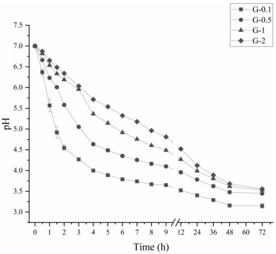 Figure 1 shows the pH of glycinin during lactic fermentation. Glycinin at different protein concentrations, namely, 0.1%, 0.5%, 1% and 2% (w/v), are abbreviated as G-0.1, G-0.5, G- 1 and G-2 hereafter. During 72 h of fermentation, the pH reduced progressively from 7.0 to 3.15–3.55 (Figure 1). This was attributed to the generation of lactic acid by lactic acid bacteria (LAB), thus lowering the pH of the glycinin solution [16]. The most significant decline was observed during the first 6 h of fermentation. The decline rate of G-0.1, G-0.5, G-1 and G-2 was 0.54, 0.44, 0.35 and 0.28 △pH/h, respectively. A higher glycinin concentration was related to a slower pH decline rate. This might correspond to the stronger buffering capacity of protein at high concentration. The decline in pH slowed down during 6–72 h of fermentation. At 72 h, G-0.1, G-0.5, G-1 and G-2 reached 3.14, 3.45, 3.53 and 3.55. According to this result, the fermentation terminal pH (FT-pH) at 7.0, 6.0, 4.5, 4.0 and 3.5 was selected in further research sampling.