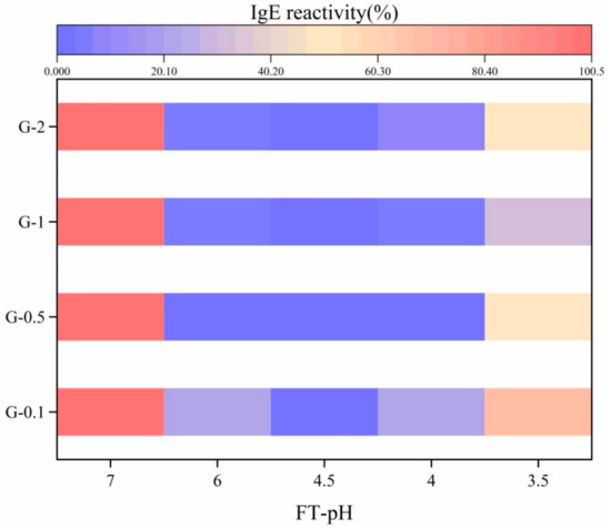 The fermentation terminal pH effectively influenced IgE reactivity of glycinin. According to different terminal pH, IgE reactivity demonstrated a “U-shape” curve regardless of glycinin concentration. From FT-pH 7.0 to 4.5, IgE reactivity exerted a sharp decrease and reached the lowest value, 0.1–0.24% at FT-pH 4.5. A further decline in FT-pH induced an incomplete recovery of IgE reactivity. IgE reactivity increased to 2.70–20.24% at FT-pH 4.0 and further increased to 32.75–69.85% at FT-pH 3.5. Previous research found the IgE binding capacity of lectin decreased significantly along with the reduction in pH from 7.2 to 3.0 [14]. Due to the different types of proteins and treatment methods, our result was not completely consistent with this finding.