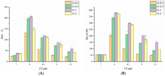 Particle size distribution for D(4,3) (A) and D(v,0.90) (B) of glycinin at different fermentation terminal pH (FT-pH). G-0.1 (orange), G-0.5 (green), G-1 (purple), G-2 (yellow).