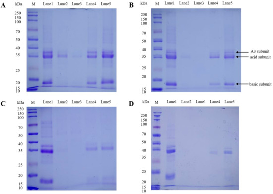 SDS-PAGE was conducted to further investigate the protein profile of untreated and fermented glycinin (Figure 4). Unfermented glycinin exerted three subunits—11S A3, acidic and basic subunits (Lane 1, Figure 4). All fermented samples featured the rapid disappearance of basic and A3 subunits, whereas the acidic subunit remained 0–25.54% at FT-pH 6 and further dropped to 0–5.78% at FT-pH 4.5 (Lane 2–3, Figure 4). The disappearance of bands might be due to the formation of a protein aggregate/gel matrix with lower solubility, which prohibited their entrance to the gel [28]. This indicates the A3 and basic subunits might be the preferred subunits in the formation of protein aggregate (G-0.1 and G-0.5) or gel (G-1 and G-2). The acidic subunit, however, seemed to be the less preferred subunit and was partially trapped in the protein aggregates/gel matrix, especially at higher glycinin concentrations (G-0.5, G-1 and G-2) (Lane 2, Figure 4). Further fermentation allowed the bands to gradually reappear on the gel (Lanes 4–5, Figure 4). At FT-pH 4.0 or lower, all three subunits were gradually observed on the gel for G-0.1 and G-0.5 (Lane 4, Figure 4A,B), whereas G-1 and G-2 mainly demonstrated the acidic subunit (Lane 4, Figure 4C,D). This indicates the acidic subunit was more easily released from the gel/aggregation matrix compared to basic/A3 subunits. The low glycinin concentration had a stronger capacity to release the previously mentioned protein subunits from the gel/aggregation matrix.
