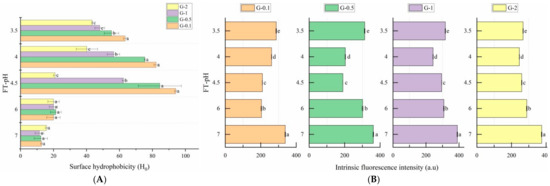 Change in surface hydrophobicity (A) and intrinsic fluorescence intensity (B) of glycinin at different FT-pH. G-0.1 (orange), G-0.5 (green), G-1 (purple), G-2 (yellow). Ho: surface hydrophobicity. a.u.: arbitrary unit. The significant difference (p < 0.05) between the samples collected at the same FT-pH (A) or at the same concentration (B) is denoted by lower-case letters (a–e) on the right side of bars.