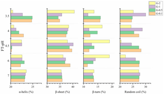 Change in secondary structures (α-helix, β-sheet, β-turn and random coil) during lactic fermentation under different concentrations. x axis: samples collected at different FT-pH values; y axis: four secondary structures (α-helix, β-sheet, β-turn and random coil). G-0.1 (orange), G-0.5 (green), G-1 (purple), G-2 (yellow).