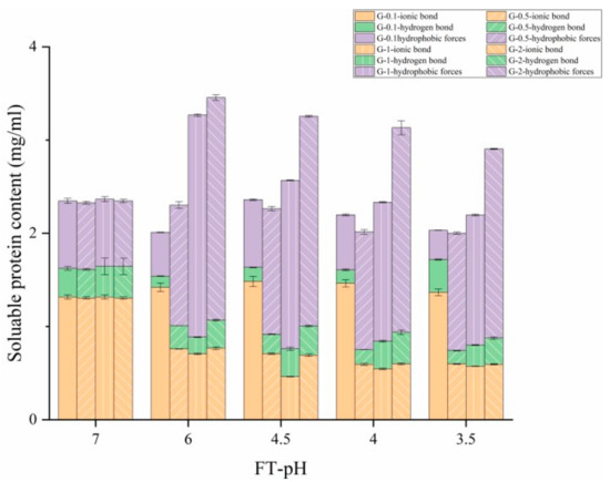 Figure 7 represents the proportions of protein fractions that interacted with the ionic bond, hydrogen bond and hydrophobic forces. The initiation of fermentation allowed a total enhancement of interactions between proteins, which peaked at FT-pH 6.0 for G-0.5, G-1 and G-2. G-0.1; however, the highest value was demonstrated at FT-pH 4.5. Protein interactions reached the highest point at FT-pH 6.0 for most of the investigated samples, probably due to the aggregation or gelation of glycinin [26,43]. This was consistent with the result of the gelation behavior and greatest particle size obtained at this FT-pH. A decrease in protein interactions indicates a looser structure at FT-pH 4.5, 4.0 and 3.5. In addition, samples with higher glycinin concentration elicited more intensive interactions between proteins, suggesting a higher requirement of interactive forces was needed to maintain their structures.