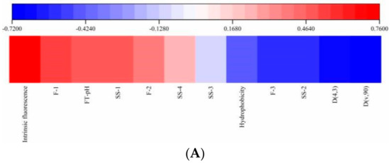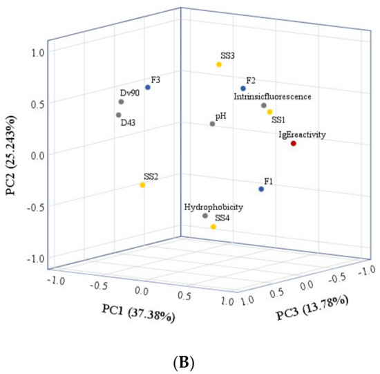 PCA was conducted to identify the relationship between IgE reactivity, reduction against FT-pH, particle size and conformational index (Figure 8). Four principal components (PC), PC1-4, represented 37.38%, 25.24%, 13.78% and 9.33%, respectively, of a variable majority (85.73%). IgE reactivity (0.933, 0.147, −0.074, 0.230) was closely correlated with intrinsic fluorescence intensity (0.717, 0.522, 0.113, 0.070), SS1 (α-helix) (0.595, 0.407, −0.160, −0.599), F1 (ionic bond) (0.722, −0.283, 0.162, −0.094), and pH (0.496, 0.400, 0.657, 0.133), indicating fermentation-induced conformational changes greatly affected the glycinin IgE reactivity. D(4,3) (−0.651, 0.359, 0.585, −0.268) and D[v,0.90] (−0.740, 0.454, 0.415, −0.190) showed a negative correlation with IgE reactivity, demonstrating that glycinin aggregated into large particles favored a reduction in IgE reactivity. Meinlschmidt suggested protein aggregation had a major contribution on IgE reactivity reduction [16], which was confirmed by our investigation. In addition, hydrophobicity (−0.351, −0.736, −0.433, −0.176), F-3 (hydrophobic forces) (−0.752, 0.526, −0.046, 0.174) and SS-2 (β-sheet) (−0.661, −0.383, 0.172, 0.490) showed a negative correlation with IgE reactivity, whereas SS-3 (β-turn) (−0.239, 0.733, −0.505, −0.101) and SS-4 (0.390, −0.635, 0.488, 0.045) were less correlated with IgE reactivity. These structural changes, overall, indicate an opening of the protein structures, which might lead the epitopes located on the surface of proteins to be buried and hidden in the structure and the destruction of some conformational epitopes. Previous research also found the unfolding of protein secondary and tertiary structures resulted in reduced immunoreactivity [46].