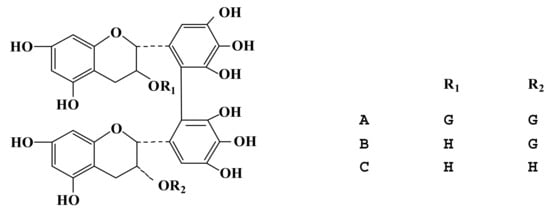 - Tanaka, T.; Watarumi, S.; Matsuo, Y.; Kamei, M.; Kouno, I. Production of theasinensins A and D, epigallocatechin gallate dimers of black tea, by oxidation–reduction dismutation of dehydrotheasinensin A. Tetrahedron 2003, 59, 7939–7947. [Google Scholar] [CrossRef]
