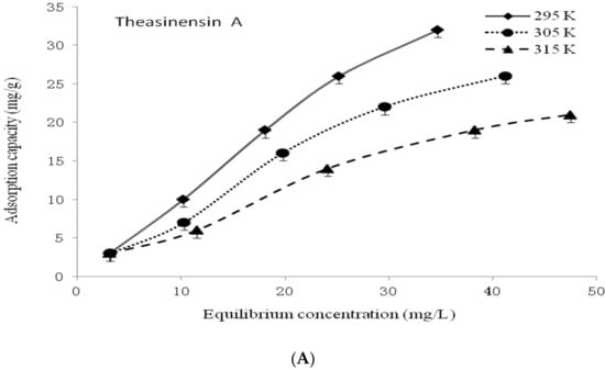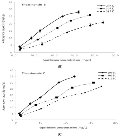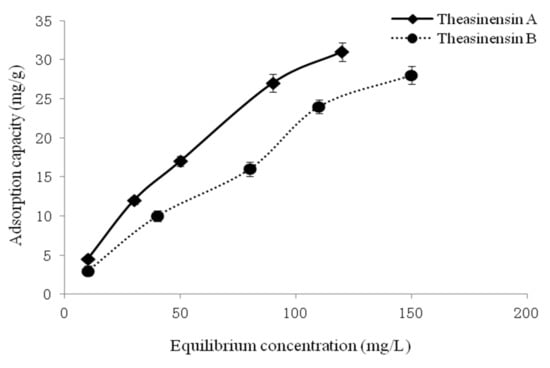 According to the experimental data, the isotherm adsorption curves of HP20 macro-porous resin for different theasinensins at different temperatures were drawn. All experiments were performed in triplicate, and average data obtained from the binding studies was used for the calculations of the binding parameters.
