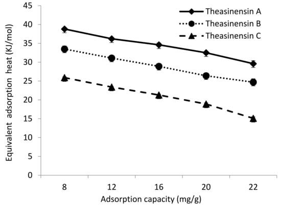As a result, the adsorption capacity of HP20 to theasinensin A, theasinensin B, and theasinensin C increased with the increase of equilibrium concentration (Figure 4). However, as the adsorption capacity of theasinensins by HP20 resin increased, the equivalent differential adsorption heat value decreased instead. For adsorption sites with uniform adsorption capacity, there was no force between adsorbate molecules. The heat of adsorption had nothing to do with the amount of adsorption. However, in the case of uneven surface capacity of the adsorbent, it was necessary to consider the interaction between theasinensins molecules. In addition, the adsorption heat changed with the surface coverage θ of the HP20 resin.