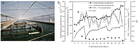 Seawater used in the present study was rich in Na (8531.667 mg L−1), K (303.318 mg L−1), Mg (824.333 mg L−1), and Ca (240.399 mg L−1). Furthermore, other important elements necessary for metabolism in microalgae, including Fe (0.008 mg L−1) and P (0.029 mg L−1), were found in the seawater. Heavy metal elements, including Pb, Cd, As, Hg, and Cr, were not detected (Table 1). Freshwater A. platensis was successfully cultured in the medium with the nutrients supplemented by NaHCO3, FeSO4, H3PO4, and seawater in a raceway pond (Figure 1a). As shown in Figure 1b, the areal production of A. platensis, shown as the biomass concentration, increased with culture time from 106.68 g m−2 to 222.42 g m−2 after 26 days. The biomass productivity varied from −11.33 g m−2 d−1 to 21.97 g m−2 d−1 during the whole cultivation process. The concentrations of nitrate-nitrogen were always extremely low throughout the cultivation. Due to cellular metabolisms, to absorb CO2 from the medium, pH in the culture medium steadily rose higher. In this study, CO2 was supplied to the A. platensis culture, in order to adjust the pH values between 8.3 and 9.5—most of the time, above 9 (Figure 1b).