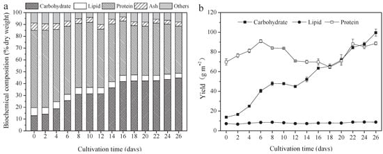 The protein, carbohydrate, lipid, and ash contents of A. platensis, cultured in the raceway pond and determined every 2 days, are shown in Figure 2a. In the A. platensis biomass, proteins were the most-reduced substances, followed by lipid and ash. During the culture period, the content of proteins, lipids, and ash in A. platensis decreased significantly (p ≤ 0.01), from 65.4% DW to 39.9% DW, 6.8% to 4.0% DW, and 6.1% to 3.4% DW, respectively. On the contrary, the carbohydrate content was 12.9% DW on day 0 and rapidly increased to 42.2% DW on day 18 (p ≤ 0.01); thereafter, no significant changes were observed (p > 0.05). Figure 2b offers information about the changes in carbohydrate, protein, and lipid yields. The yields of all the main three constituents showed an increasing tendency as the culture time increased. The carbohydrate yield was the highest, followed by protein and lipid. Carbohydrate yield achieved a maximum of 99.6 g m−2 on day 26, 7.2 times that of day 0. Protein yield, however, increased from 69.8 g m−2 to 88.7 g m−2, only showing an 18.9% improvement. In contrast, lipid yield was far less than the carbohydrate and protein yield, only 8.8 g m−2 on day 26.