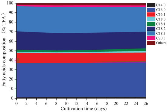 Eight kinds of fatty acids were observed in A. platensis, including myristic acid (C14:0), palmitic acid (C16:0), palmitoleic acid (C16:1), octadecanoic (C18:0), oleic acid (C18:1), linoleic acid (C18:2), γ-linolenic acid (C18:3), and eicosatrienoic acid (C20:3) (Figure 3). C16:0 was the primary fatty acid in A. platensis, comprising of 35.6% to 37.0% of the TFA (total fatty acids), followed by C18:3, C18:2, and C16:1 at the ranges of 26.0–27.4% TFA, 17.5–19.3% TFA, and 9.7–11.0% TFA, respectively. Among these fatty acids, few changes were observed in the proportions of C16:0 and C18:3, while the proportions of C14:0, C16:1, C18:0, C18:1, C18:2, and C20:3 changed. Such culture conditions promoted the accumulation of C14:0, C18:0, C18:1, and C20:3, with increases of 70.86%, 36.41%, 39.35%, and 17.12% over that of day 0 (p ≤ 0.05), respectively.