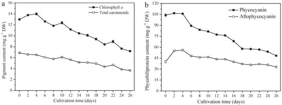A. platensis produces high-value pigments, including PC, APC, chlorophyll a, and carotenoids. PC and APC are water-soluble protein pigments. Chlorophyll a and carotenoids are fat-soluble pigments. The contents of these four pigments all decreased significantly (p ≤ 0.01). From day 0 to day 26, the PC content decreased from 104.0 mg g−1 DW (day 0) to 48.4 mg g−1 DW (day 26), 40.0 mg g−1 DW to 33.0 mg g−1 DW, 13.0 mg g−1 DW to 7.2 mg g−1 DW, and 6.9 mg g−1 DW (day 0) to 3.7 mg g−1 DW for APC chlorophyll a and the carotenoids, respectively (Figure 4a,b). The variation of PC content among them was the greatest; a 53.5% reduction was observed on day 26, followed by carotenoids, chlorophyll a, and APC, at a reduction of 46.4%, 44.6%, and 17.5%, respectively.