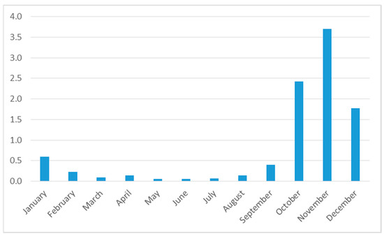 Many edible insect species are only seasonally available [18]. However, different species appear at different times of the year, and there are some insects which are available year-round. It is not clear how seasonal availability translates into seasonal patterns of consumption. As Figure 1 shows, however, there is a clear pattern in Sandrandahy: the harvesting of insects is highest between October and December. (As explained above, we did not collect data on monthly consumption of insects but, as the households consume nearly all insects immediately and hardly any insects are bought, sold, or preserved, seasonal consumption should follow seasonal harvesting patterns.) Some 82% of the total amount is collected in these three months, which are, at the same time, the start of the lean season. This is explained by the fact that the most commonly consumed species—adult scarab beetles, but also cicada—only appear in these months, whereas other species that are available year-round, such as locusts, crickets, and the larvae of Coleoptera, are not collected much.