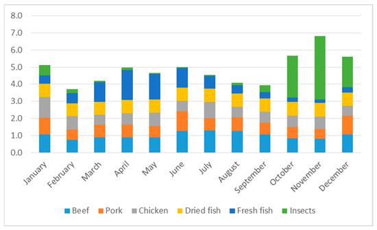 For comparison, Figure 2 shows the monthly amounts (in kg) of beef, pork, chicken, and fish consumed by households over the year, as well as insects. The consumption of meat fluctuates only slightly throughout the year (Coefficient of Variation (CV) of 15%), whereas that of (fresh and dried) fish varies more (CV of 32%), both together reaching their highest levels between April and June, diminishing afterwards to reach their lowest levels in October and November, exactly the months when insect harvesting is at its peak. Between October and December, insects constitute 44% of the total amount of meat, fish, and insects consumed, meaning that edible insects (over-)compensate for the lower levels of meat and fish consumption. Furthermore, due to insect consumption, this is the period with the highest total consumption of meat, fish, and insects.