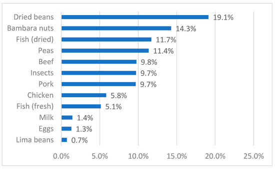 The quantities of meat, fish, and insects shown in Figure 2, and of protein-rich crops were converted into amounts of protein consumed by taking the average protein content of the different sources (see Table A1 and Table A2 in the Appendix A). In general, animal protein sources are limited: an average household of 5.5 members ingests 69 kg of animal products (including insects) per year, containing 9.9 kg of proteins (SD 6.2 kg), of which 1.8 kg comes from insects (SD 2.0 kg). This equals an average per capita animal protein consumption of around 5 g/day (not differentiating between adults and children, male and female), lower than the average national supply of 9 g/day [19]. Besides animal products, protein-rich crops, mainly legumes (beans, bambara nuts, peas), are consumed. The protein coming from these plants is 8.3 kg per household, not much lower than that of animal products. Figure 3 shows the different sources of proteins in the region. Insects are responsible for nearly 10% of protein consumption of the rural population, in the same range as pork and beef.