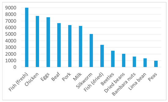 In the survey, people used local terms for insects, which normally do not denominate specific species, but often a certain stage in the life cycle of a certain insect family or order. For example, Sakivy denominates larvae, and Abado pupae of Coleoptera. The insect species, families, and orders belonging to each local name were identified by an entomologist of the ProciNut project. To determine the nutritional composition of the groups of species identified, bibliographic research was carried out. The keywords used were the scientific names of the species. The nutritional composition used for the locally denominated insects is given in Table A1 in the Appendix A. In some cases, an average protein content was calculated when data were available from different sources. In two cases (snout beetles and wild silkworm), where no data could be found, nutritional composition was used from different families belonging to the same order. In cases where nutritional information was only available for dry matter (beetle larvae and cicadas), an average moisture content of 70% was applied to calculate the protein content for fresh matter. In order to compare the protein content of commonly consumed animal- and plant-based food items, we used the tables given by the National Bureau of Nutrition (ONN) of Madagascar (see Table A2 in the Appendix A).